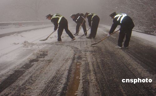 2009年1月4日,安徽省巢湖市含山縣交警大隊(duì)太湖山中隊(duì)的干警正在太湖山險(xiǎn)要路段鏟雪。元月3日夜間,該縣迎來(lái)今冬第一場(chǎng)雪,部分路段已積上厚厚的冰層。為了給即將來(lái)臨的春運(yùn)工作打下堅(jiān)實(shí)的基礎(chǔ),維護(hù)良好的道路交通秩序,給廣大群眾營(yíng)造良好的交通環(huán)境,當(dāng)天一大早,含山縣交警大隊(duì)太湖山中隊(duì)組織民警上路巡邏,重點(diǎn)加強(qiáng)對(duì)山路的安全隱患排查清理。中隊(duì)民警鏟除幾個(gè)連速?gòu)澋郎系暮駥颖,并用掃帚將鏟除堆積的冰雪清掃出路邊,保證了過(guò)往車輛的安全通行。中新社發(fā) 豐成 攝
