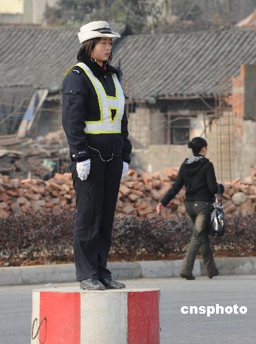 一名女警在四川大地震重災(zāi)區(qū)的北川縣安昌鎮(zhèn)街頭上崗指揮交通。北川縣城被大地震摧毀后,縣機(jī)關(guān)轉(zhuǎn)移此地辦公,將于2009年春節(jié)后開始新北川城的建設(shè)。中新社發(fā) 賈國(guó)榮 攝