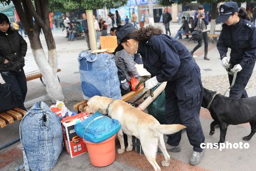 1月11日春運開始,南寧鐵路局警方為保障春運安全,加強了車站的安全措施,動用警犬搜排爆炸物。中新社發(fā) 蔣雪林 攝
