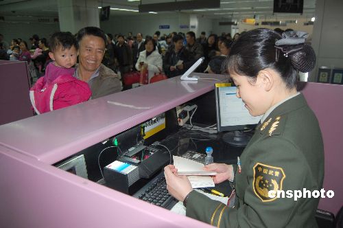 一月十一日,春運(yùn)首日,福州長(zhǎng)樂國(guó)際機(jī)場(chǎng)迎來旅客入境高峰,入境旅客較平日大幅增長(zhǎng)。針對(duì)春運(yùn)旅客入境高峰,福州機(jī)場(chǎng)邊檢站調(diào)整現(xiàn)場(chǎng)執(zhí)勤警力,開足通道,加強(qiáng)引導(dǎo),全力保障旅客快速通關(guān)。中新社發(fā) 龍景定 攝