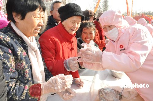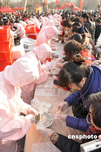 1月18日是農歷新春小年,鄭州市“2009歡樂購物過大年”活動在綠城廣場舉行,2009人在鄭州市綠城廣場一同包餃子并現場制作品嘗。中新社發(fā) 劉書亭 攝