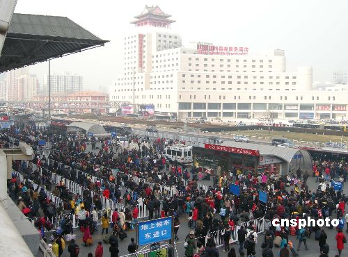 2009年1月21日,北京西站人頭攢動、旅客如織。據(jù)北京西站方面透露,根據(jù)車次的售票情況看,21日單日上車客流將超過23萬人次,達到本次春運節(jié)前的峰值。中新社發(fā) 玉龍 攝