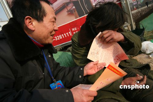 1月22日,許昌市救助管理站的工作人員在救助一個生活無著人員。春節(jié)即將到來,為更好地向困難群體獻(xiàn)愛心、送溫暖,不讓一個生活無著人員流落街頭,當(dāng)日,河南省許昌市救助管理站開展“迎新春社會關(guān)愛生活無著人員”活動,對符合救助條件的求助者,無償提供食宿、幫助聯(lián)系親屬等。這次活動除與各區(qū)縣救助站同時開展宣傳、咨詢活動外,還會派流動小分隊走上街頭,對生活無著人員進(jìn)行勸導(dǎo),實施現(xiàn)場救助。中新社發(fā) 牛書培 攝