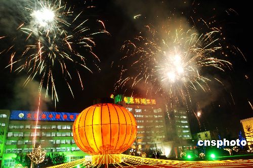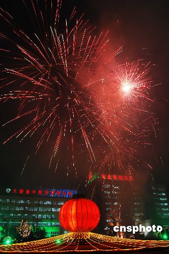 1月25日除夕夜,東北特鋼集團(tuán)大連基地廣場(chǎng)五彩繽紛禮花綻放空中,迎接牛年到來。當(dāng)晚,大連市大街小巷爆竹聲聲,人們?cè)诮k爛的煙花中迎來2009農(nóng)歷新年。中新社發(fā) 劉德斌 攝