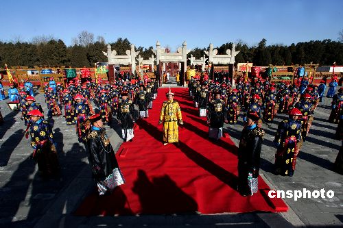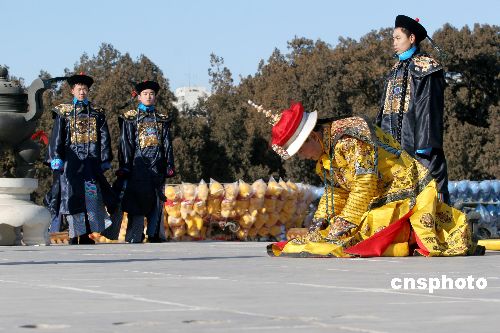 1月26日農(nóng)歷正月初一,第24屆地壇春節(jié)文化廟會如期舉行,廟會歷時8天,至2月1日截止。每年地壇廟會,地壇公園芳澤壇都會舉行場面宏大的仿清祭地表演,“皇帝”帶領文武百官、侍衛(wèi)儀仗等200余人身著盛裝祭祀,祈求地神保佑、國泰民安、風調雨順、五谷豐登,今年的祭地表演則因為“草根皇帝”的海選而備受關注。從普通市民中遴選出來的“草根皇帝”李少華正式上任,迎神送神、三叩九拜,在數(shù)百游園觀眾的注視下,黃袍加身的李少華邁著堅定的步伐,完成了一次皇家禮儀文明之旅。中新社發(fā) 富田 攝