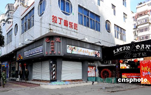 一月三十一日二十三時五十五分,福建福州長樂市區(qū)鄭和路北側(cè)的“拉丁”酒吧內(nèi),因年輕人開生日聚會在桌面上燃放煙花,引燃天花板釀成特大火災(zāi),現(xiàn)已導(dǎo)致十五人死亡,還有三人正在搶救中。圖為二月一日上午,警方繼續(xù)在發(fā)生火災(zāi)的酒吧展開調(diào)查。中新社發(fā) 鄭祚聲 攝