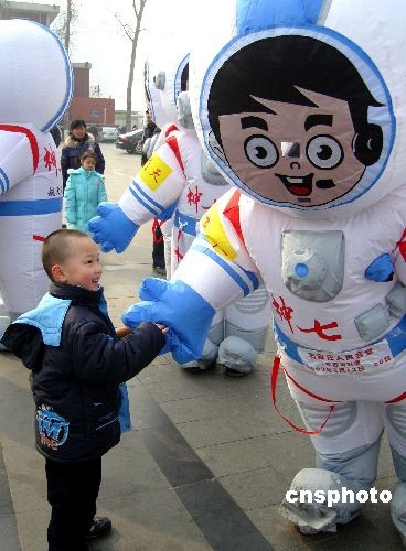 2月4日,《飛天壯歌——中國首次太空漫步航天展》新聞發(fā)布會(huì)現(xiàn)場,河北兒童與扮成“航天員”的工作人員握手!讹w天壯歌——中國首次太空漫步航天展》全國巡展即將于2月13日在河北省石家莊市啟動(dòng)。主辦方稱,這是中國航天史上規(guī)模最大、規(guī)格最高的航天尖端科技成就展,將有大量神七航天實(shí)物現(xiàn)場展出,包括神七宇宙飛船返回艙、價(jià)值三千萬元人民幣的宇航員艙外航天服、火箭整流罩殘骸,以及翟志剛遨游太空出艙時(shí)揮舞的國旗等重要實(shí)物。中新社發(fā) 牛琳 攝