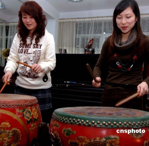 二月四日晚,二名女性觀眾在福建首家私人樂(lè)器博物館——福州宜天樂(lè)器博物館即興演奏“中古佳麗”民族大鼓。由福建一著名樂(lè)器收藏家創(chuàng)辦的福建首家私人樂(lè)器博物館共收納古今中西樂(lè)器逾千件,惹人流連。 中新社發(fā) 劉可耕 攝