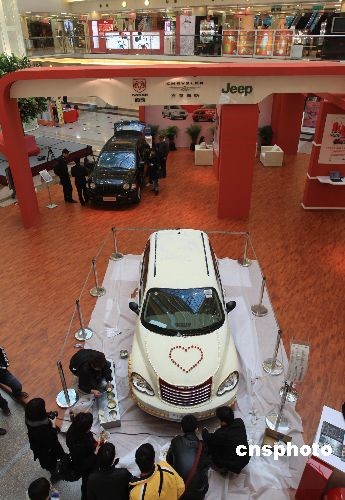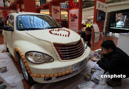 2月8日,上海兩位巧克力工藝師用兩天的時間、超過200公斤白巧克力原料,精心打造一款時尚酷車,浪漫約會即將到來的“情人節(jié)”。中新社發(fā) 潘索菲 攝