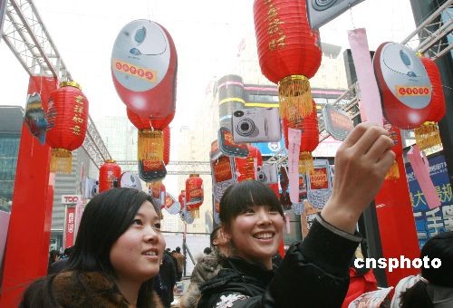 2月8日,人們?cè)诒本┲嘘P(guān)村競(jìng)猜謎語。為迎接元宵佳節(jié),北京中關(guān)村舉行元宵燈謎會(huì),用“電腦”、“相機(jī)”、“鼠標(biāo)”、“手機(jī)”等造型懸掛的燈謎,吸引了不少市民駐足猜謎。中新社發(fā) 陳曉根 攝
