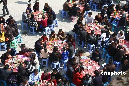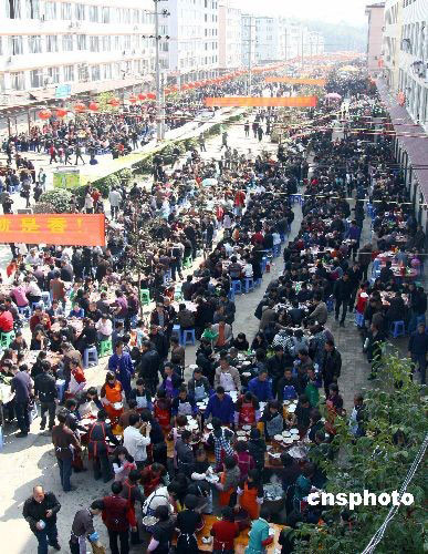 圖為位于雅陽的兩千多桌宴席。2月9日,中國傳統(tǒng)的元宵節(jié),在浙江省泰順縣,在這一天就會邀請四方的賓客相聚在洲嶺、雅陽、西旸等地。今年雅陽的“百家宴”歷史以來規(guī)模也是最大的一次,達到一千多桌,一萬多人,且和文化旅游相組合,推出了許多的節(jié)目。現(xiàn)在,“百家宴”已經(jīng)成為一種帶有民間聯(lián)誼性質(zhì)的活動,人們歡聚一堂聯(lián)絡(luò)感情,互送祝福,譜寫盛世和諧新篇章。中新社發(fā) 鎬璽 攝