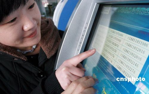 2月21日,中國(guó)移動(dòng)3G手機(jī)“188”號(hào)段放號(hào)進(jìn)入第二天,北京市民在營(yíng)業(yè)廳內(nèi)的自動(dòng)終端前挑選自己滿意的手機(jī)號(hào)碼。2月20日起北京移動(dòng)正式對(duì)188號(hào)段進(jìn)行放號(hào),188號(hào)段SIM卡是特別針對(duì)3G終端,只能在移動(dòng)3G終端上使用,北京的手機(jī)用戶開始進(jìn)入了3G時(shí)代。中新社發(fā) 鄭雄增 攝