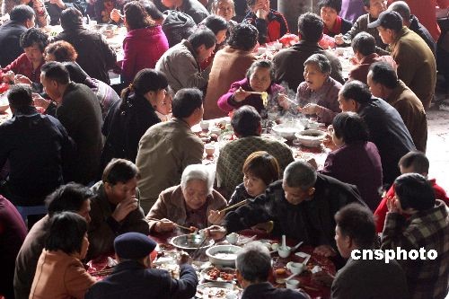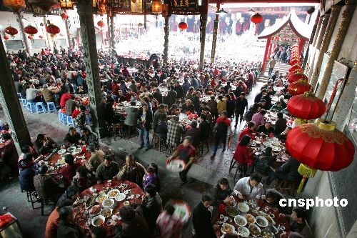 二月二十三日農(nóng)歷正月二十九,是福州傳統(tǒng)的敬老節(jié)日“拗九節(jié)”,福州倉山區(qū)城門鎮(zhèn)臚雷村陳氏祠堂里擺起千人“孝順宴”。祠堂里里外外放置一百九十多張桌子,近二千位年過半百的老人安坐席上,欣賞戲臺(tái)上演員閩劇片斷的精彩表演,而村里年輕人則忙里忙外,端菜送茶。中新社發(fā) 楊婀娜 攝