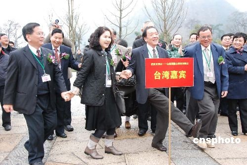 2009年2月24日上午,在浙江省杭州市天目山山腳下,天目山與阿里山的代表舉行了“杭州天目山——臺(tái)灣阿里山締盟姐妹山”合約簽字儀式,聯(lián)手推介旅游項(xiàng)目。在儀式現(xiàn)場代表們手拉手跳起了阿里山的傳統(tǒng)舞蹈。中新社發(fā) 姜越潮 攝