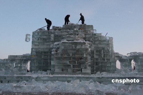 2月28日,施工人員在牡丹江市城區(qū)冰堡旅游景點(diǎn)拆除融化的冰雕作品!傲⒋骸边^后,素有“雪城”之稱的黑龍江省牡丹江市氣溫回升較快,城區(qū)內(nèi)的各大冰雪旅游景點(diǎn)的冰雪作品開始融化,失去寒冬里的風(fēng)采。從當(dāng)日起,城區(qū)冰雪旅游景點(diǎn)管理部門對(duì)融化的冰雕作品進(jìn)行拆除。中新社發(fā) 莊文斌 攝