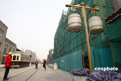 3月3日,工人正在對北京前門大街加緊施工。為迎接新中國成立60周年大慶,前門大街部分建筑已經搭起綠網,開始對外壁進行裝修工作,預計整個前門大街建筑外壁的裝修工程將于“五一”前完工。中新社發(fā) 鄭雄增 攝