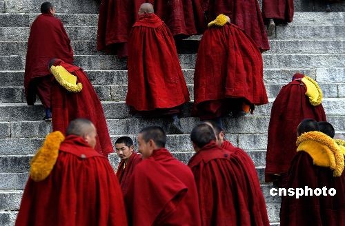 3月4日,中國藏歷新年正月初八,西藏拉薩哲蚌寺舉行傳昭大法會,該寺僧人辯經結束后進入措欽大殿。中新社發(fā) 廖攀 攝
