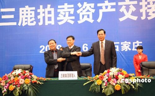 3月6日,石家莊三鹿集團管理人李愛民與北京三元集團董事長張福平、河北三元總經(jīng)理高青山,在河北省石家莊亞太大酒店進行了拍賣資產(chǎn)交接協(xié)議簽署儀式。圖為簽約儀式結(jié)束后,三人微笑握手。中新社發(fā) 翟羽佳 攝