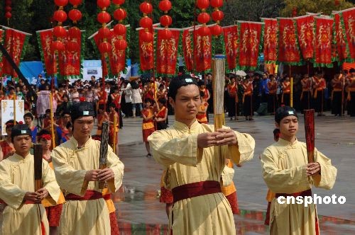 三月七日,已有一千年四百多年歷史的廣州南海神廟舉辦“波羅誕”千年廟會,吸引數(shù)萬名游客前往趕會。圖為在廟會開幕式上舉行的大型祭海儀式。中新社發(fā) 梁永強 攝