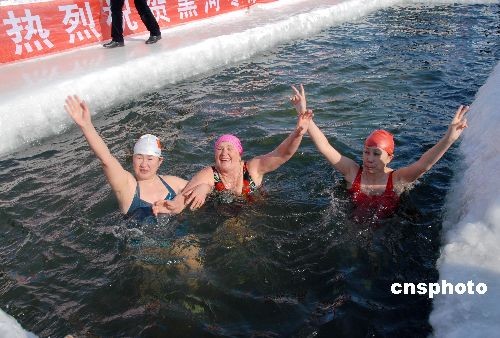 3月8日,中俄邊城15名婦女冬泳愛好者在界河黑龍江冰池中暢游,共同歡度第99個(gè)“三八”國際勞動(dòng)?jì)D女節(jié)。中新社發(fā) 邱齊龍 攝