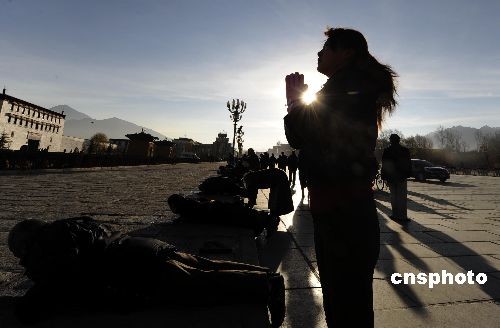 3月10日上午,西藏拉薩布達(dá)拉宮前的信眾正在虔心祈禱,布宮廣場(chǎng)氣氛祥和。中新社發(fā) 廖攀 攝