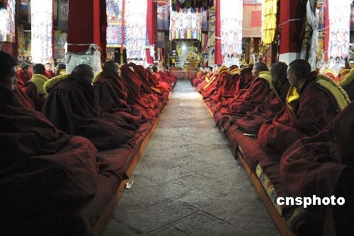 3月10日,西藏拉薩哲蚌寺,僧人們在措欽大殿誦經(jīng)。中新社發(fā) 廖攀 攝