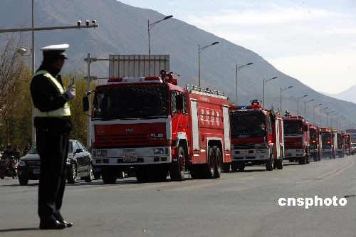 3月10日,西藏公安消防部隊(duì)特種裝備車輛亮相拉薩街頭,26輛特種消防車輛在市區(qū)的主要街道進(jìn)行拉動演練。中新社發(fā) 劉震 攝