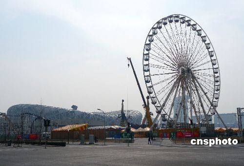 2009年3月10日,在北京奧林匹克公園“鳥巢”東北角,摩天輪、海盜船、太陽神車等在內的娛樂設施已經搭建完畢,目前正在加緊調試中,預計將于本月中旬開業(yè)迎客。據悉,此次嘉年華不同于前幾年舉辦的環(huán)球嘉年華活動,包括包括海盜船等在內的40個機動游樂項目和56個競技游樂項目會給游客耳目一新的感覺,而且隨著季節(jié)的更替和游客喜愛程度的不同,這些大型游樂設施會定期替換。中新社發(fā) 玉龍 攝