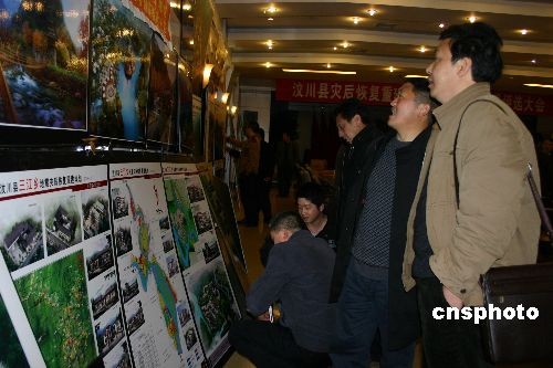 3月11日,為提高災(zāi)后恢復(fù)重建規(guī)劃編制、建設(shè)項(xiàng)目單項(xiàng)設(shè)計(jì)的科學(xué)性和嚴(yán)謹(jǐn)性,充分發(fā)揮廣大城鄉(xiāng)規(guī)劃及建筑設(shè)計(jì)工作者的積極性和創(chuàng)造性,四川地震重災(zāi)區(qū)汶川縣舉行“汶川縣災(zāi)后恢復(fù)重建規(guī)劃設(shè)計(jì)優(yōu)秀成果評(píng)選活動(dòng)”。全縣13個(gè)鄉(xiāng)鎮(zhèn)的恢復(fù)重建城市設(shè)計(jì)方案紛紛亮相,參與評(píng)比,征求專家及群眾意見。圖為公眾參觀設(shè)計(jì)方案。中新社發(fā) 霍潺 攝