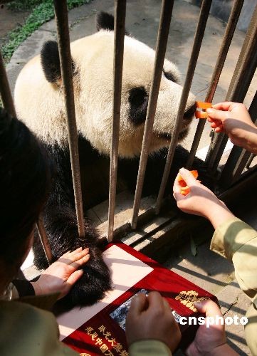 三月十三日上午,福州熊貓世界中心四只來自地震災(zāi)區(qū)的大熊貓,在特制模盤里各自踩下一個(gè)彌足珍貴的“掌印”。這四個(gè)“掌印”將作為大熊貓萬里行感恩活動的見證,送往四川臥龍大熊貓研究中心,作為永久留念保存。中新社發(fā) 楊婀娜 攝