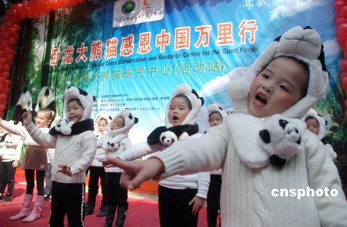 2009年3月15日,為了感謝各地對臥龍大熊貓的愛心援助,在汶川地震發(fā)生即將一周年之際,由四川臥龍中國保護(hù)大熊貓研究中心主辦的“感恩世界點亮希望 臥龍大熊貓感恩中國萬里行”活動福州站在福州熊貓世界舉行。中新社發(fā) 張 斌 攝
