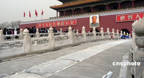 背景資料:為迎接新中國(guó)成立60周年,天安門管委會(huì)從2009年2月18日起對(duì)金水橋?qū)嵤┍Wo(hù)修繕,工程擬于2009年5月1日前完工,并整體對(duì)外開放。 中新社發(fā) 玉龍 攝
