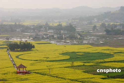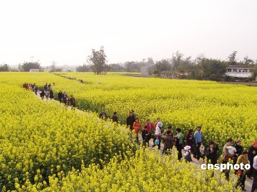3月15日,游人在重慶市潼南縣崇龕油菜花基地觀賞金燦燦的油菜花。第二屆重慶潼南菜花節(jié)自3月5日開(kāi)展以來(lái),每天到此賞花的游人絡(luò)繹不絕。3萬(wàn)余畝油菜花被兩江水環(huán)抱,游人或泛舟環(huán)游,或登高望遠(yuǎn),甚至可乘熱氣球升空俯瞰萬(wàn)畝油菜花織出的太極圖案。中新社發(fā) 陳仕川 攝
