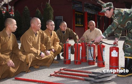 2009年3月17日,山西省盂縣永清寺院內(nèi),消防戰(zhàn)士在向僧人講解滅火器的正確使用方法。當(dāng)日,盂縣消防大隊(duì)開展“消防安全進(jìn)寺廟”活動,消防戰(zhàn)士深入寺廟,手把手教僧人使用消防器材,現(xiàn)場培訓(xùn)僧人在火災(zāi)發(fā)生后第一時(shí)間內(nèi)協(xié)助消防員進(jìn)行救援、緊急疏散的技能。中新社發(fā) 程瑜 攝