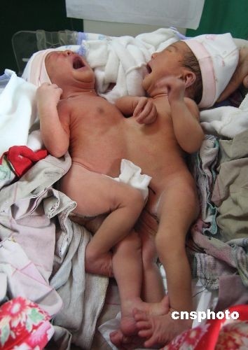 3月18日,躺在湖南省新化縣中醫(yī)院婦產(chǎn)科內(nèi)的連體嬰兒。16日,湖南省婁底市新化縣石沖口鎮(zhèn)紅寨村28歲的段曉艷在新化縣中醫(yī)院剖腹產(chǎn)下該市首例連體嬰兒。連體嬰兒都是女嬰,體重4.8公斤。面對這對連體女嬰,段曉艷一家人憂心忡忡,不知后期手術(shù)費用如何籌措。目前,連體嬰兒已得到了首筆1000元的捐款。18日,湖南省兒童醫(yī)院的醫(yī)生將連體嬰兒接去長沙市治療。 中新社發(fā) 郭國權(quán) 攝