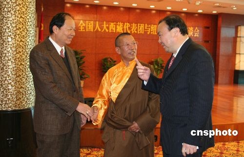正在美國訪問的中國全國人大西藏代表團18日與紐約當?shù)貎S學界舉行座談,相互交流。圖為代表團團長、全國人大代表、西藏自治區(qū)人大常委會副主任新雜·單增曲扎活佛(中)與紐約當?shù)貎S領親切交談。中新社發(fā) 魏晞 攝