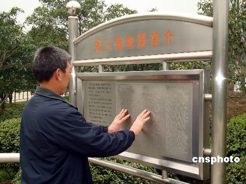 2009年3月19日,盲人在蘇州盲人植物園內(nèi)“手讀”盲文植物介紹。陽(yáng)春三月,春暖花開(kāi),一些盲人來(lái)到蘇州盲人植物園踏青“賞”花。蘇州盲人植物園占地面積12000多平方米,有60多種觀賞植物。每種花草樹(shù)木前都有盲文寫(xiě)的植物介紹,還配有語(yǔ)音輔助系統(tǒng),只要盲人一觸摸,就會(huì)有相應(yīng)的語(yǔ)音服務(wù)為盲人介紹相關(guān)植物知識(shí)。中新社發(fā) 王建康 攝