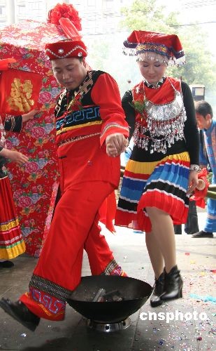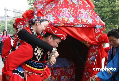 3月21日,長沙一對新人在市區(qū)舉辦了一場別開生面的中式民族婚禮,賺足了路人的眼球。中新社發(fā) 鄧霞 攝