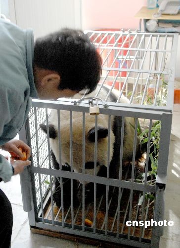 3月22日,在北京動(dòng)物園生活了9個(gè)月的8只奧運(yùn)大熊貓開(kāi)始起程返回四川老家。臨行前,工作人員正在喂大熊貓食物,并依依不舍為其送行。中新社發(fā) 鄭雄增 攝
