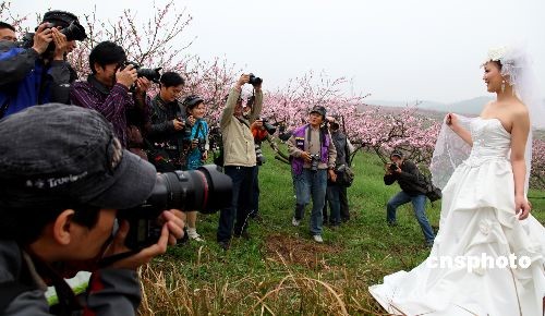 3月21日,攝影師們正在以婚紗美女為模特進(jìn)行拍攝。由宜昌市攝影家協(xié)會(huì)、三峽廣電新聞網(wǎng)及“真愛(ài)”婚紗攝影共同舉辦“三峽春天攝影大賽”日前在枝江萬(wàn)畝桃花園開(kāi)賽,百余名專業(yè)攝影師及攝影愛(ài)好者以攝影會(huì)友。 中新社發(fā) 望作信 攝