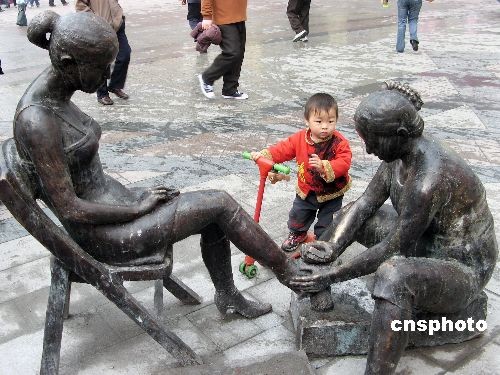 2009年3月23日,長江三峽港口城市湖北宜昌,碼頭工人、炸蘿卜餃子、賣魚和擦皮鞋的青銅雕塑逐漸在街頭安裝固定。普通市民生活鑄成銅雕,這在長江沿線還是首次。中新社發(fā) 韓玉洪 攝