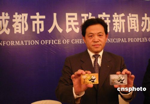 圖為成都市政府副秘書長鄧工力向媒體介紹發(fā)行的熊貓金卡和銀卡。3月24日,成都市將在成都11個景區(qū)對持有熊貓金卡的游客(配合本人身份證使用)實行免門票,對省內持熊貓銀卡的游客實行門票半價優(yōu)惠。這次對省外游客發(fā)放熊貓金卡1500萬張,省內發(fā)放熊貓銀卡500萬張。門票減免時間為即日到今年12月31日止。中新社發(fā) 王俊 攝