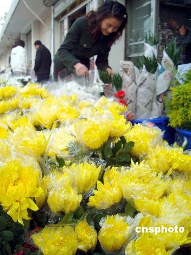 3月24日,顧客在蘇州市養(yǎng)育巷一家花店選購(gòu)祭祀菊花。隨著清明節(jié)的臨近,蘇州鮮花市場(chǎng)上菊花、百合等花卉熱銷(xiāo),不少蘇州市民選擇用鮮花替代元寶蠟燭祭奠親人,樹(shù)立文明祭拜新風(fēng)。中新社發(fā) 王建康 攝