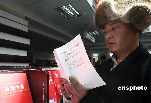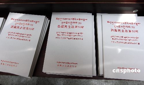 3月25日,紀(jì)念西藏民主改革50周年獻禮圖書首發(fā)式在拉薩舉行。藏文版《西藏民主改革50年》白皮書在拉薩首發(fā)。中新社發(fā) 杜洋 攝