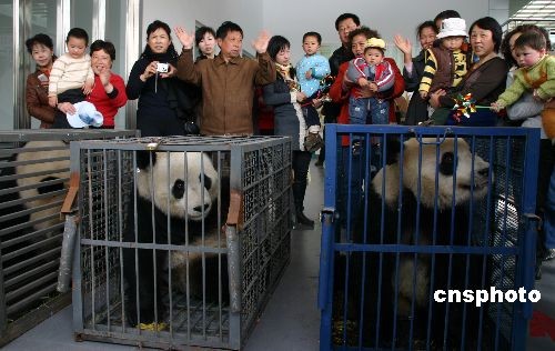 2009年3月26日,在南京紅山森林動物園生活了近一年的美靈、晶晶、仙子三只大熊貓即將返回四川臥龍老家,眾多市民專程趕來為大熊貓送行。2008年4月18日,來自四川臥龍中國保護大熊貓研究中心的三只3歲左右的大熊貓租借到南京紅山森林動物園。中新社發(fā) 阿董 攝