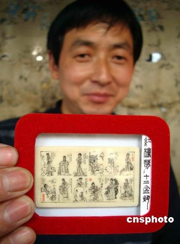 3月26日,郭克杰在蘇州觀前街民間工藝亭展示他在象牙上雕刻的微雕作品“紅樓夢十二金釵”。 該象牙微雕作品是郭克杰花費(fèi)近一個(gè)月的時(shí)間創(chuàng)作的,作品長約5厘米,寬約2.5厘米,十二位人物造型栩栩如生。中新社發(fā) 王建康 攝