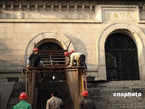 據(jù)南京市中山陵園管理局消息,為迎接孫中山奉安大典80周年,南京市近日投資300多萬元啟動中山陵主體建筑維修工程。據(jù)了解,這也是自新中國成立近60年來,中山陵第二次大規(guī)模維修,上次規(guī)模較大的維修是在1982年!拔崴乐,可葬于紫金山麓,因南京為臨時(shí)政府所在地,所以不忘辛亥革命也!弊裾諏O中山先生的遺愿,中山陵于1926年春開始修建,至1929年建成,當(dāng)年6月1日,中山先生的靈柩奉安于此。 中新社發(fā) 楊潔 攝