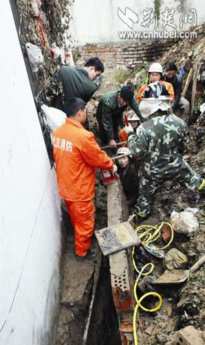 為保證被困人員安全同時防止第二次塌方,消防員迅速找來四根粗大的木料,將周邊松動的水泥墻死死頂住。實施救援時,消防員首先嘗試用風(fēng)鎬鑿碎溝底的水泥管,幾分鐘后很快鑿穿,不料余師傅的右腿依然動彈不得;接著找來兩個氣墊,通過腳踩增壓,以求擴大余師傅右腿所在的空間,結(jié)果效果不理想;繼而又找來千斤頂,還是無濟于事。發(fā)現(xiàn)只有吊起坍塌的墻體,才能從根本上解決問題。于是調(diào)來吊車,隔著院墻伸出吊臂,正好坍塌墻體上有個排水孔,消防員設(shè)法將鋼絲繩繞過了排水洞。吊車司機小心翼翼地操作,既要減輕被夾者的痛苦,又要繞過坍塌現(xiàn)場的線纜,而且盡可能在起吊過程中確保墻體不能斷裂。幸好,起吊墻體四周泥土較為松軟,11時20分左右,墻體被成功吊起,消防戰(zhàn)士迅速將余師傅抱出水溝。劉蔚丹 饒純武 黃康 攝