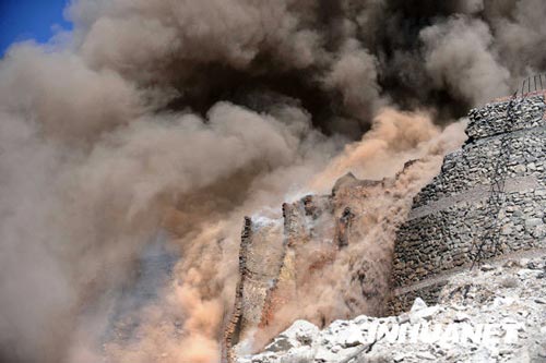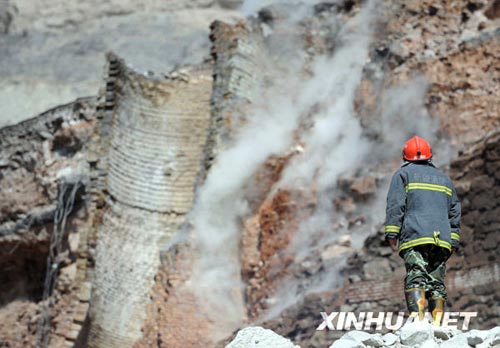 目前,救援工作仍在進(jìn)行中。由于石灰窯窯口前的臺(tái)地面積很小,且有一條大裂縫,消防車一時(shí)難以駛?cè);消防人員用高壓水槍作業(yè)時(shí),水一噴上去窯體即不斷塌方,救援難度較大。