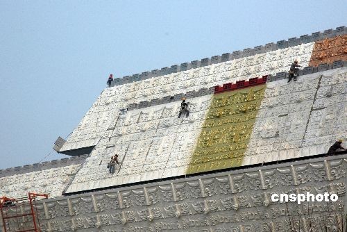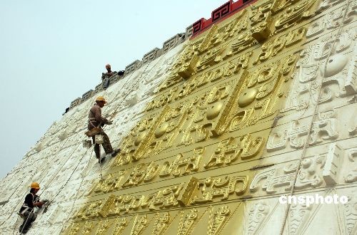 4月5日,河南省安陽市中國文字博物館建設(shè)現(xiàn)場,建設(shè)者們在進(jìn)行施工。中國文字博物館自2007年在安陽市正式開工建設(shè)以來,各項建設(shè)工作正在有條不紊地向前推進(jìn),2009年底有望開館。據(jù)悉,建成后的中國文字博物館由字坊、廣場、主體館、倉頡館、科普館、研究中心、交流中心等建筑組成,將是世界上第一家以文字為主題的國家級專業(yè)博物館。中新社發(fā) 常中正 攝